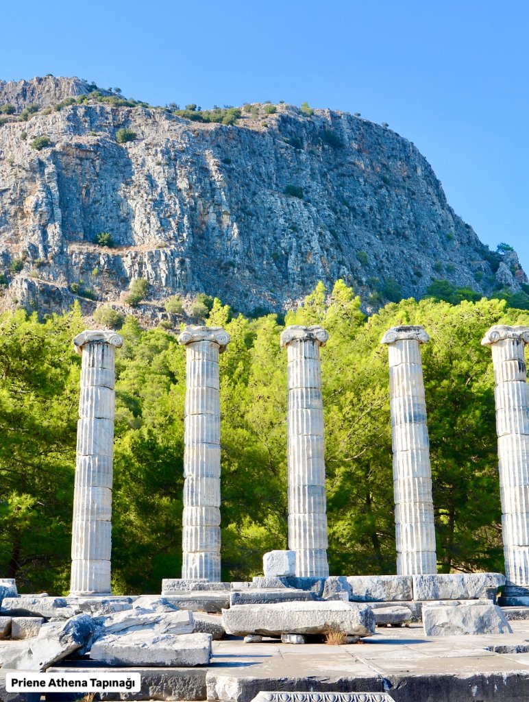 Görsel Alt Metin Önerisi: “Priene Athena Tapınağı İyon sütunları ve tepe manzarası”